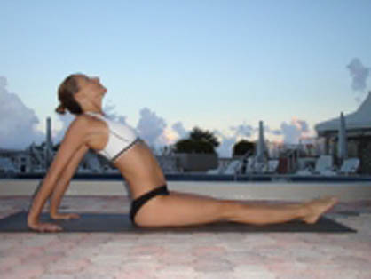 - EXHALE. Place hands flat on the floor behind the buttocks, with the fingers pointing at the hips.